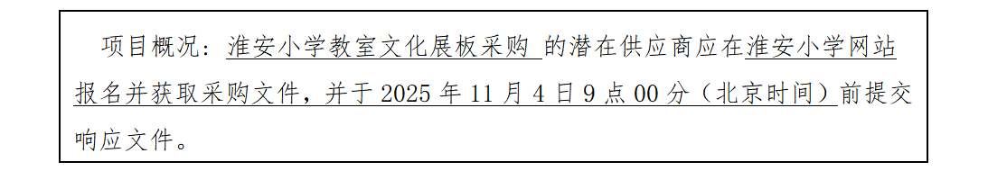 (六)采购需求: 淮安小学教室文化展板采购,详见磋商文件第五章项目采购需求。