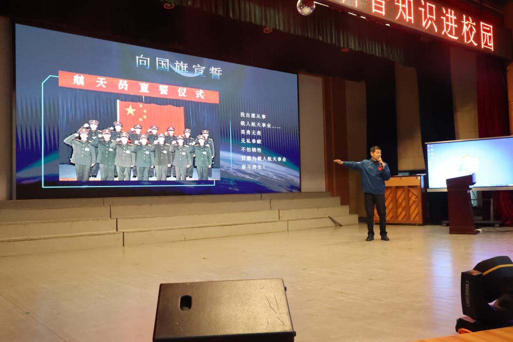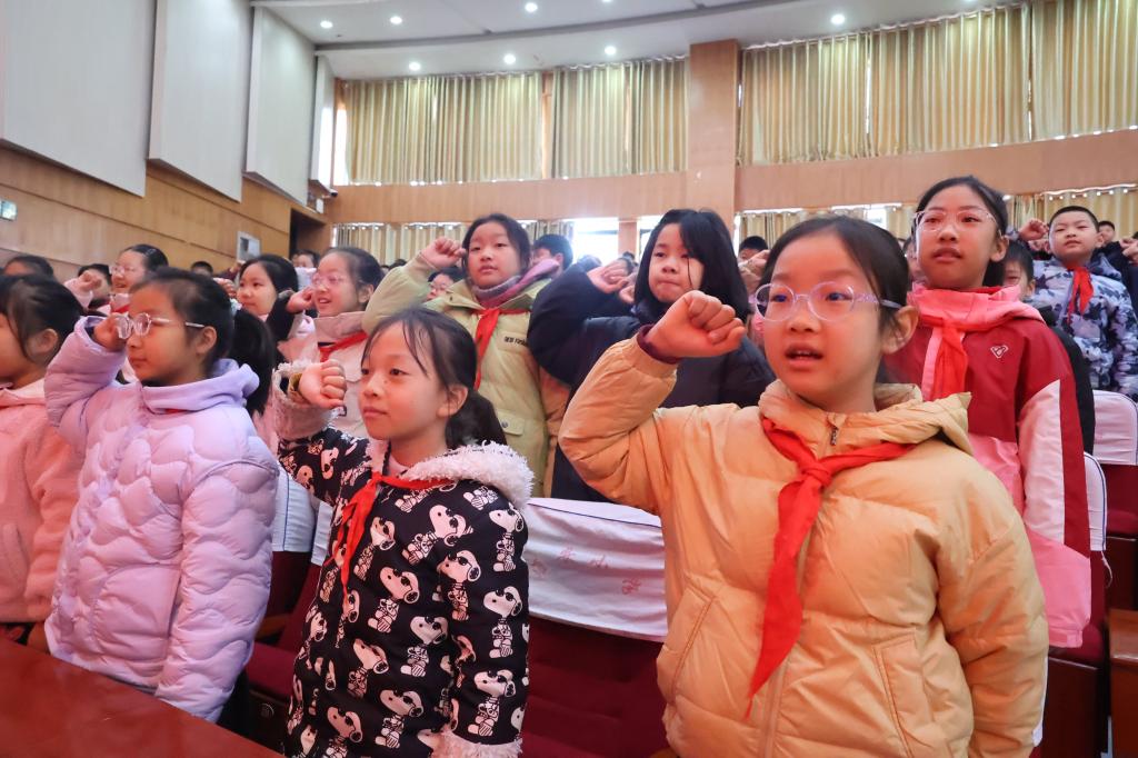 “我志愿追逐星辰大海,传承航天精神,刻苦学习,报效祖国!” 在赵传东的带领下,孩子们举起右拳庄严宣誓,稚嫩的声音回荡在报告厅,眼神中满是前所未有的坚定。